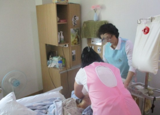 몸이 불편한 환우분을 정성껏 씻겨드리는 장면입니다.
